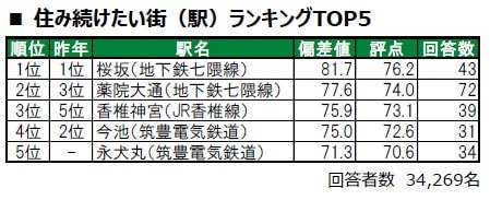 福岡市中央区に位置する桜坂が、唯一偏差値80台の極めて高い評価を得て、4年連続で1位に輝きました。2位は福岡市中央区に位置する薬院大通(昨年3位)、3位は福岡市東区に位置する香椎神宮(昨年5位)です。その他トップ10内で初登場の駅は、5位永犬丸、6位遠賀野で、いずれも昨年は累計回答者数が30名未満でランキングの集計対象外だった筑豊電気鉄道沿線の駅です。