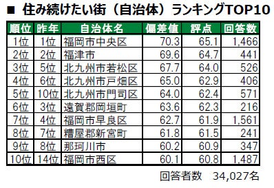 1位は2年連続で福岡市中央区で、唯一偏差値70台の高い評価を得ています。福岡市中央区は、「街に誇りがある」「街に愛着がある」「住みここち」「住みたい街」でも1位となる高い評価を得ている街です。2位は2年連続で福津市、3位は昨年5位から順位を上げた北九州市若松区です。その他トップ10内では、4位北九州市戸畑区(昨年6位)、5位北九州市門司区(昨年10位)など、北九州市の行政区が昨年よりランクアップし、トップ5にランクインしています。