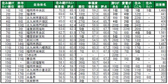糟屋郡新宮町が、2年連続で1位に輝きました。2位は古賀市(昨年4位)、3位は筑紫野市(昨年8位)で、いずれも昨年から順位を上げてトップ3入りしています。その他トップ10内では、7位福岡市城南区(昨年11位)、10位北九州市八幡西区(昨年16位)が、昨年から順位を上げてトップ10入りしています。