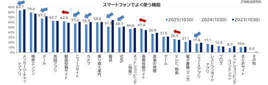 スマートフォンでよく使う機能は、「メッセージ・チャット」、「メール」、「ニュース」、「カメラ」、「電話」など、これまで主流だった機能が軒並み減少し、動画や画像投稿サイト、テレビ・映画などの映像コンテンツ系が増加しました(図1)。