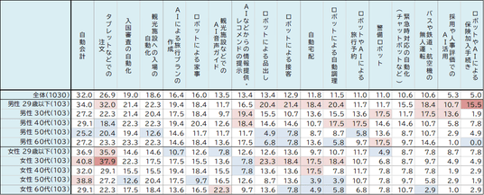 また、AIに限らない「無人サービス」の利用意向については、「自動会計(32.0%)」、「タブレットなどでの注文(26.9%)」、「入国審査の自動化(19.0%)」など、手続きを効率化できるサービスが、「旅行プランの作成(16.4%)」、「音声ガイド(13.5%)」、「レコメンドの提示(13.4%)」などの付加価値サービスを上回りました。性年代別では、29歳以下の男性で、無人サービスの利用意向が全体的に高い傾向がみられます(表3)。