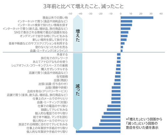 3.生活の中で、3年前と比較して増えたこと、減ったこと:キャッシュレス化やネット購入は一段と浸透。コロナ禍で普及した「会議・ミーティング(オンライン)」は残ったが、「旅行先でのテレワーク」や「シェアオフィス・コワーキングスペースでの業務」、「在宅勤務」などは減少傾向へ