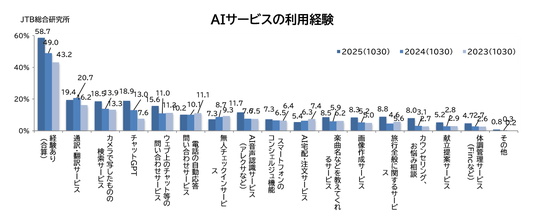 6.AIサービスの利用経験は、58.7%と前年より約10ポイント上昇。旅先で利用してみたいAIサービスは、「旅行先のグルメ情報検索(29.6%)」、「言語翻訳(25.1%)」、「行程・ルート提案(24.7%)」などが上位に。