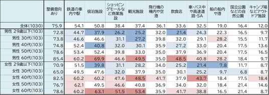 整備してほしい場所で最も割合が高かったのは、「鉄道の車内や駅(54.1%)」、「宿泊施設(50.8%)」、「ショッピングモールなどの商業施設(38.4%)」でした。性年代別には、女性40代は子育て中の人も多いせいか、「車・バス中や高速道路・SA」や「キャンプ場などのアウトドア施設」の割合も比較的高くなっています。