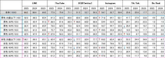 スマートフォンで利用する主なSNSや動画投稿サービスとしては、「LINE」、「YouTube」、「Instagram」、「X」となり、上位の顔ぶれは昨年と変わりませんでしたが、「LINE」と「X」はやや減少し、「Instagram」が「X」を超えて3位となりました。「X」は特に女性の利用率が減少しています。また、リアルな日常を共有できるとZ世代に人気の「BeReal.」もわずかながら上昇し、29歳以下女性の利用率が10%を超えました(表1)。