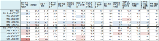 旅先で利用してみたいAIサービスで最も多かったのは、「旅行先のグルメ情報検索(29.6%)」で、「言語翻訳(25.1%)」、「行程・ルート提案(24.7%)」が続きました(表2)。性年代別にみると、「旅行先のグルメ情報検索」は、特に女性の60代と女性30~40代で高い傾向がみられます。