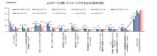 また、男性30代では「eスポーツのゲーム名(28.9%)」、男性40代と女性29歳以下では「eスポーツのイベント、大会(20.5%/25.5%)」が最も高く、男性40代では「eスポーツに力を入れている学校(15.7%)」も上位に来ており、年代・性別毎のeスポーツとの関わり方によって具体的にイメージできるものが異なりました(図10)。