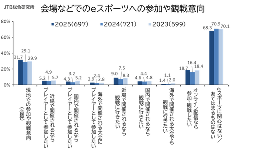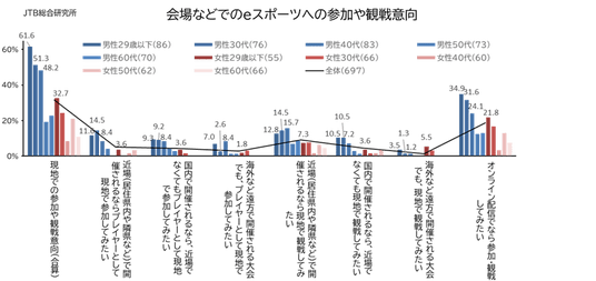 eスポーツを「知っている」と回答した人のうち、実際に現地に出向いてプレイや観戦をする意向については、「関心はない/あてはまるものはない」の割合が昨年度の70.9%から68.3%と減少しており、リアルでのeスポーツへの参加意向は微増で、特に男性29歳以下では61.6%と全体の倍近くの高い割合となりました。また、男性30代では51.3%、男性40代では48.2%、女性29歳以下では32.7%と、比較的高い関心がうかがえます(図8、図9)。