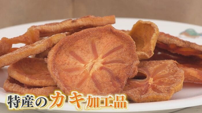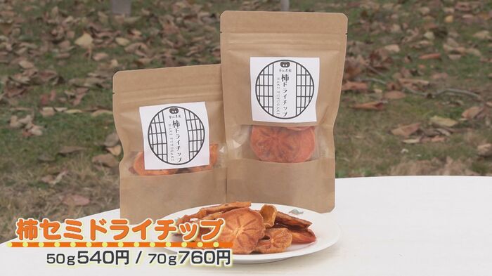 そのひとつが、柿をドライフルーツにしたという一品。2人で収穫した柿を使った加工品だ。甘柿の食感を残しながら糖度がアップしている。