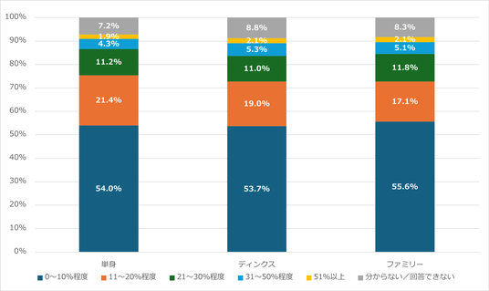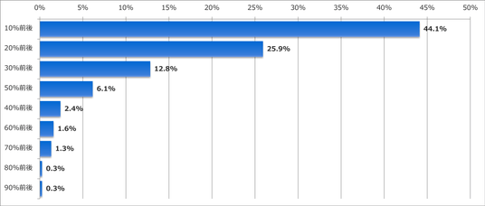 テレワークを想定した住まい探しの割合は、引き続き「1~4割程度」が中心となっており、「1割未満」とする回答は前回調査からわずかに増加している結果となりました。
