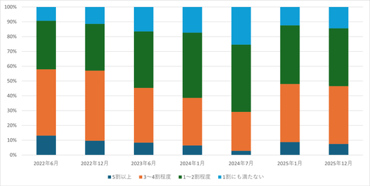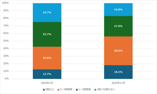 「契約の5割以上が電子契約」と回答した割合は前回(2025年1月)調査時から5.5ポイント上昇した一方で、「1割にも満たない」とする回答は7.9ポイント減少しており、電子契約の活用が着実に進捗。