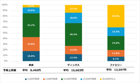 賃料予算の上昇額については、単身が平均8,460円、ディンクスが平均10,683円、ファミリーが平均13,597円となり、相場上昇を前提に、現実的な調整を行っている姿勢がうかがえます。