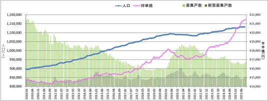 2020年3月までは転入超過が続き、賃貸需要が堅調に推移していたが、コロナ禍を境に状況が大きく変化。テレワークの普及に伴い郊外への移住が進み、都心部の人口は転出超過へ転じ、賃貸マンションの空室率上昇・募集賃料の下落が発生。