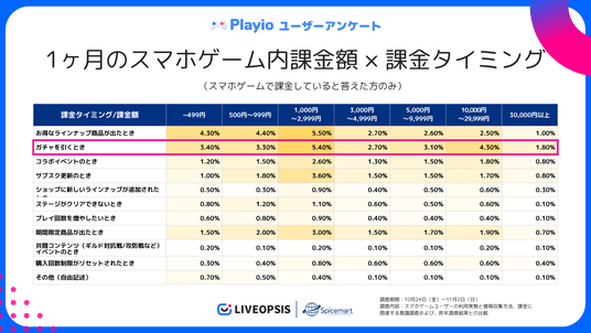 Playioユーザーアンケートより|1ヶ月のスマホゲーム内課金額 × 課金タイミング(クロス集計)