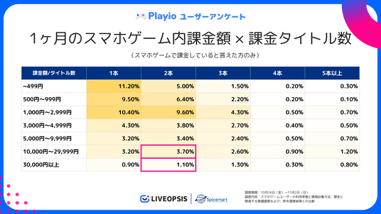Playioユーザーアンケートより|1ヶ月のスマホゲーム内課金額 × 課金タイトル数(クロス集計)