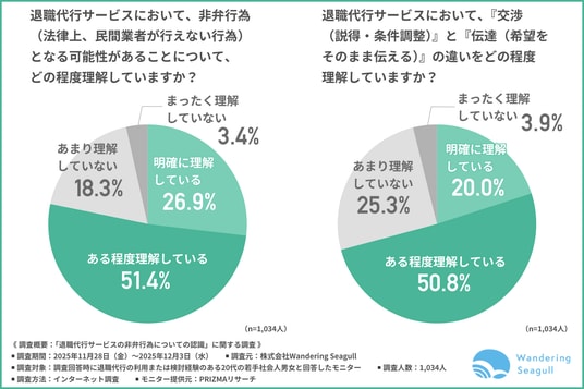 さらに、「退職代行サービスにおいて、『交渉(説得・条件調整)』と『伝達(希望をそのまま伝える)』の違いをどの程度理解しているか」について尋ねたところ、約7割が『明確に理解している(20.0%)』『ある程度理解している(50.8%)』と回答しました。
