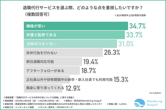 最後に、「退職代行サービスを選ぶ際、どのような点を重視したいか」と尋ねたところ、『価格が安い34.7%)』が最も多く、『弁護士監修である(33.7%)』『退職成功率が高い(31.0%)』となりました。