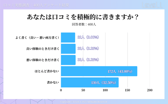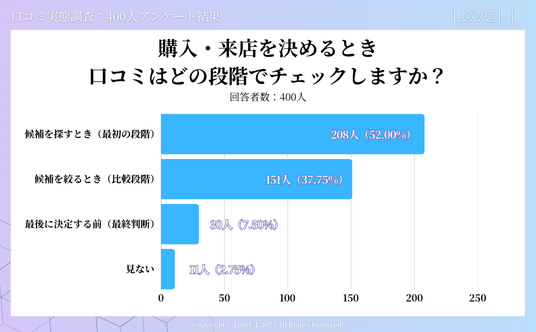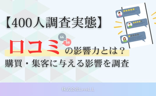 株式会社LeveL.Lは、特に実店舗を持つ事業者様へのマーケティング支援を行う中で、口コミが集客や売上に与える影響の大きさを実感してまいりました。そこで今回、消費者が実際にどの程度口コミを参考にしているのか、どのような口コミが購買や来店の判断に影響するのかを明らかにするため、400人を対象とした実態調査を実施いたしました。