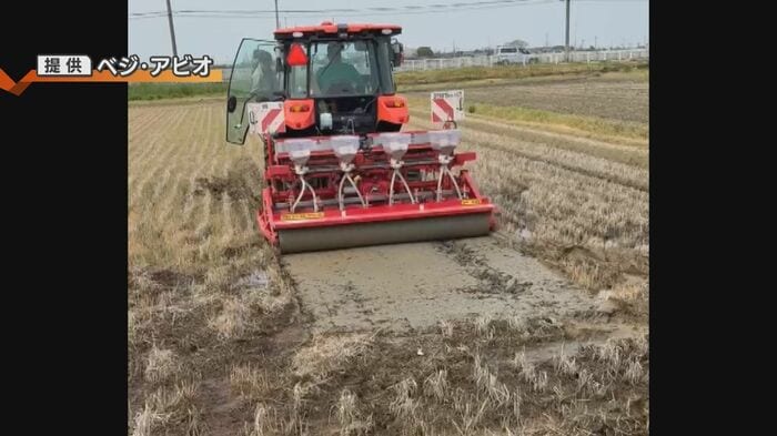 コメ作りといえば、田起こしのあと水を張った田んぼに苗を植える水稲栽培が一般的だが、“乾田直播”は水を張らない乾いた状態の田んぼに直接種をまく。