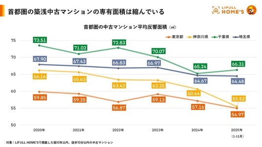 現在、首都圏のマンション市場では、価格の高騰だけでなく「専有面積の縮小化」がトレンドとなっています。新築マンションのみならず、市場に流通する築浅の中古マンションにおいても住戸のコンパクト化が進み、ゆとりある広さを確保することは年々難しくなっています。