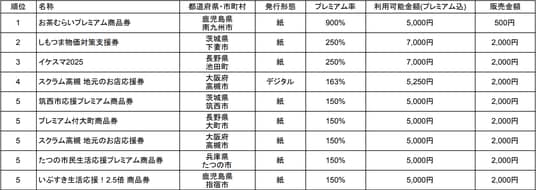プレミアム率の高い自治体・商店街のランキングは以下の通りです。地方の自治体では、プレミアム商品券のプレミアム率を高めることで、居住者の地元定着を狙っていることがわかります。