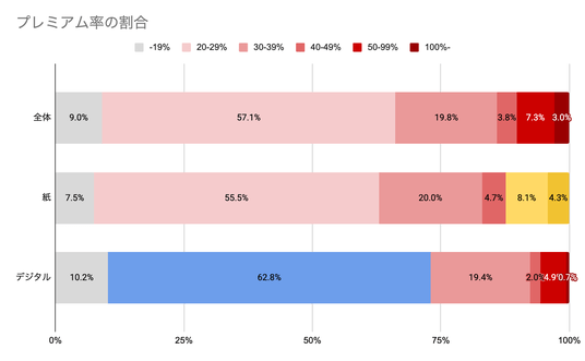 2025年に発行されたプレミアム商品券の平均プレミアム率は29%ですが、紙とデジタルでは割引率の分布が異なることがわかりました。デジタル商品券は比較的多くの人に使ってもらうことが前提にあるためか、プレミアム率20~29%の割合が62.8%と最も高く平均プレミアム率も24.1%でした。一方、紙の場合は50%以上の高プレミアム率の商品券を出す自治体が12.4%とデジタル(5.6%)よりも多く、平均プレミアム率も31.5%であることがわかりました。