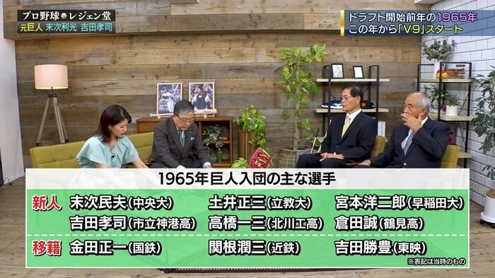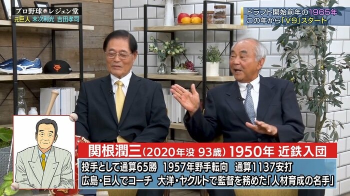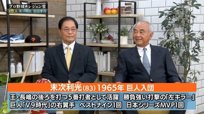 読売ジャイアンツの「V9戦士」2人がレジェン堂に。「史上最強の5番打者」末次利光氏と「強気のリード」で巨人投手陣を支えた吉田孝司氏。長嶋茂雄氏・王貞治氏らの知られざるエピソード、末次氏の伝説の逆転満塁サヨナラホームラン、“大きな壁”森昌彦氏との吉田氏のレギュラー争いなど徳光和夫が切り込んだ。