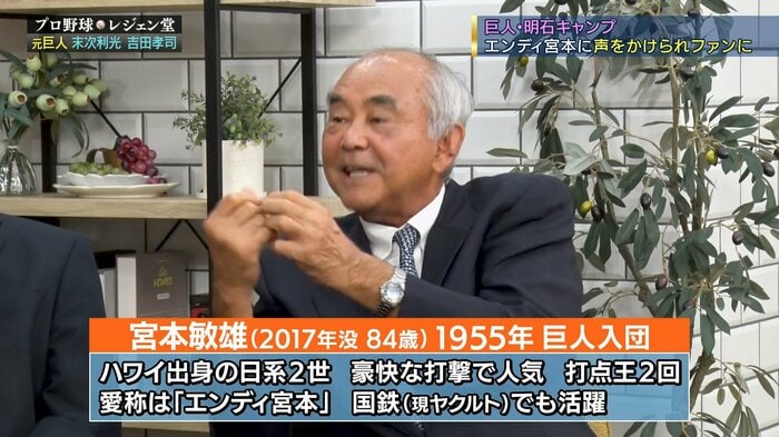 ハワイ出身の日系2世。豪快な打撃で人気、打点王2回 愛称は「エンディ宮本」。国鉄(現ヤクルト)でも活躍]