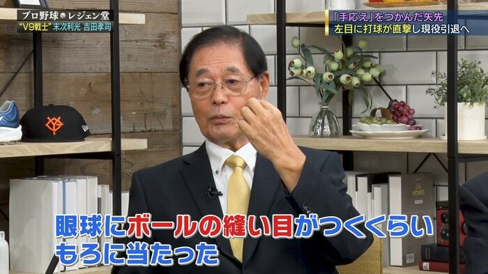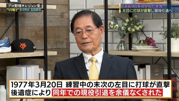 [1977年3月20日、練習中の末次の左目に打球が直撃。後遺症により同年での現役引退を余儀なくされた]