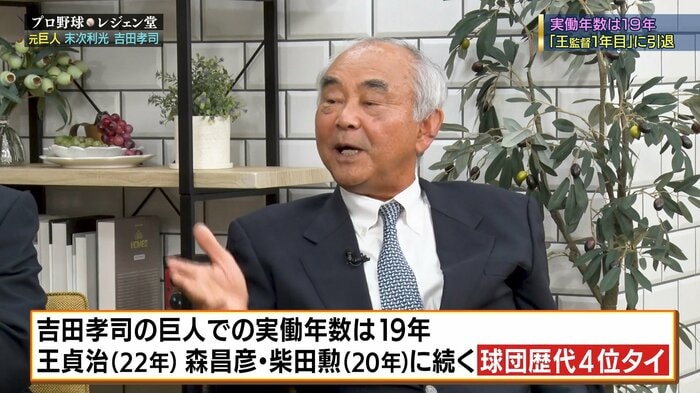 吉田孝司の巨人での実働年数は19年。王貞治(22年)、森昌彦・柴田勲(20年)に次ぐ球団歴代4位タイ。