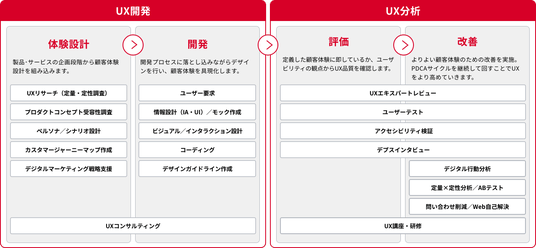 ソフトウェアの品質保証で培ったノウハウを活用し、ソフトウェア開発の企画段階からリリース後の改修まで、開発プロセスの上流から下流までをカバーするUXソリューションを展開。人間中心設計専門家をはじめとするUXのエキスパートが、製品・サービスの仕様や開発フェーズに応じて最適なユーザビリティのあり方、改善手法をご提案します。