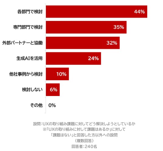 UXの取り組みに対して課題を感じている企業に、課題をどのように解決しようとしているか尋ねたところ、「各部門で対応策を検討」が44%と最多になりました。UX課題を特定部署・担当者だけに限定して対応するのではなく、全社課題と捉えて複数部門で協働しながら推進する傾向が出始めてきたことがわかります。