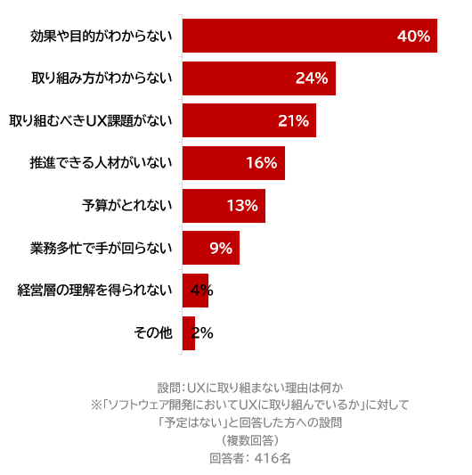 UXに取り組む予定はないと回答した企業に、その理由を尋ねたところ「効果や目的がわからない」が40%と最多になりました。企業におけるソフトウェア開発のあり方が変化するなかで、UXの効果や価値を認識し継続的にリソースを投入できる企業と、投資対効果や中長期的な事業成果との関係性を明確化できず取り組みを控える企業に二極化しはじめている可能性がうかがえます。