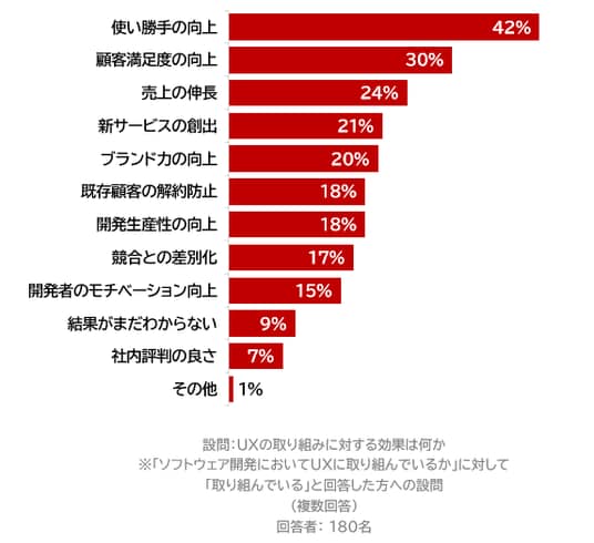 UXの取り組み効果は「使い勝手の向上」(42%)が最も多く、「守りのUX」から「攻めのUX」への転換がうかがえる。