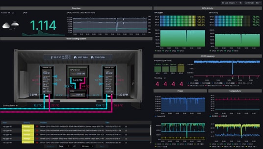 - 水冷GPUサーバー、サーバー冷却設備を実証実験用に提供するとともに、コンテナ型データセンター内の環境・ハードウェア・ソフトウェアを統合的に管理する統合モニタリングツールを構築