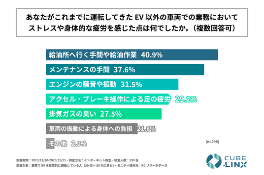 業務でEVを日常的に運転している人が、これまでに運転してきたEV以外の車両での業務においてストレスや身体的な疲労を感じた点のトップ3は、1位「給油所へ行く手間や給油作業」、2位「メンテナンスの手間」、3位「エンジンの騒音や振動」