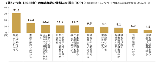 今年の年末年始に帰省しない理由は、「自宅でゆっくり過ごしたいから」が31.1%と高く、休息を優先させたい意向が強い。<図5>