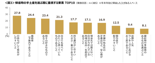 帰省時の手土産を選ぶ際に重視するのは、「日持ちがして保存がしやすいこと」(27.8%)が「価格帯」(24.4%)を上回りトップ。