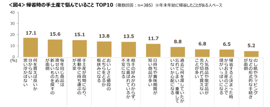 帰省時の手土産の悩みは、「何を買えばよいか分からない、思い浮かばない」「毎年同じ商品は渡せないため、新しいものを探すのが面倒」「手土産が荷物になり、移動中に持ち運ぶのが大変」「おいしさと値段のどちらをとるか板挟みになる」「相手の好みがわからず、本当に喜ばれているか不安になる」が上位。<図4>