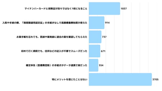 マイナンバーカードと保険証が別々ではなく1枚になること 1837入院や手術の際、「限度額適用認定証」の手続きなしで高額療養費制度が使えた 914お薬手帳を忘れても、医師や薬剤師に過去の薬を確認してもらえた 737初めて行く病院でも、住所などの記入が不要でスムーズだった 671確定申告(医療費控除)の手続きがデータ連携で楽だった 554特にメリットを感じたことはない 3705