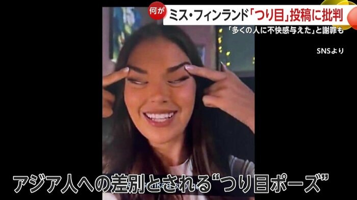 欧米などでは、アジア人への差別とされる“つり目ポーズ”。