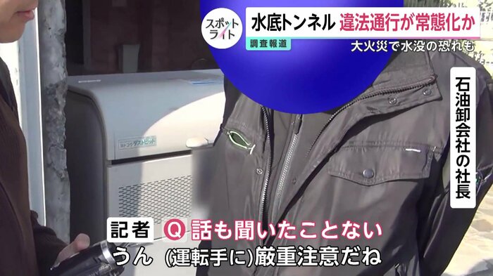 海の下をくぐる「水底トンネル」を、横浜市の石油卸会社のタンクローリーが多くの軽油を積んだまま違法に通っていたことが、FNNの調査取材で分かった。運転手は偽装行為を認めていて、危険な通行が常態化していた疑いがある。