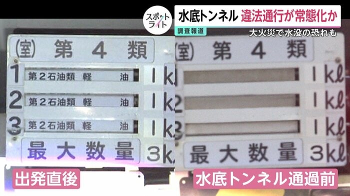 また、義務づけられた表示について、当初、軽油を3キロリットル載せているとしていたが、「空欄」に変えて水底トンネルを通過し、その後、相次いで納入先へ給油していた。