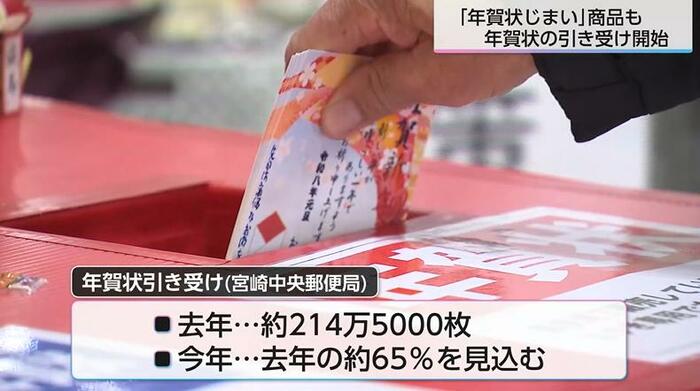 宮崎中央郵便局での年賀状の2024年引き受け枚数は約214万5,000枚で、2025年は2024年の65%程度を見込んでいる。