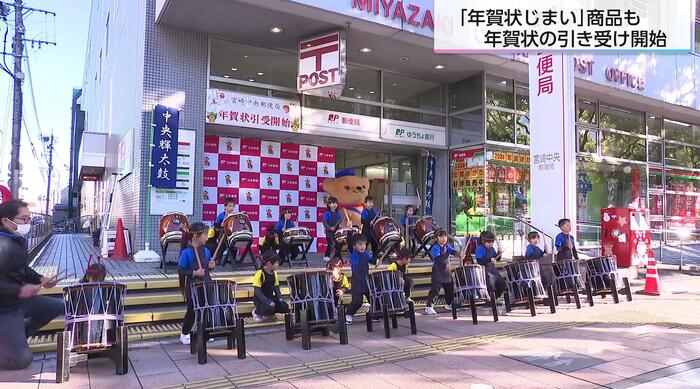 宮崎中央郵便局ではイベントが開催され、宮崎市の中央保育園の園児約20人が和太鼓を披露した。その後、園児らは手作りの年賀状を投函した。