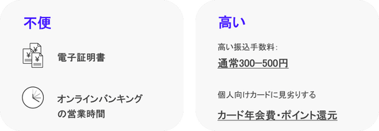 従来の法人向け金融機関は、サービスや手続きにおいてデジタル化や効率化が遅れており、これが多忙な中小企業経営者の時間とコストを圧迫しています。 特に、複雑な手続きや時間の制約、高止まりしたままの振込手数料やカード年会費などのコスト構造が、中小企業の財務体質や事業成長の足かせとなっています。