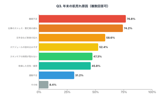 年末に肌荒れが起きる原因として考えられるものを調査しました(複数回答可)。最も多かったのは「睡眠不足」(76.8%)、次いで「仕事のストレス・繁忙期の疲れ」(74.2%)、「忘年会など飲食の乱れ」(58.6%)という結果になりました。