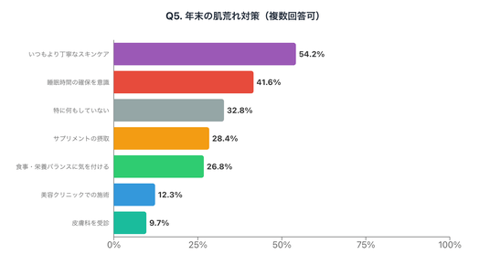 年末の肌荒れに対して行っている対策を調査しました(複数回答可)。「いつもより丁寧なスキンケア」(54.2%)が最も多い一方で、「特に何もしていない」(32.8%)という回答も3割を超える結果となりました。