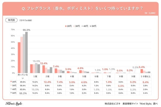 全国の20代~50代の女性2,000人を対象に、「フレグランス(香水、ボディミスト)をいくつ持っていますか?」というアンケートを実施したところ、最も多かった回答は「持っていない」で59.2%となりました。