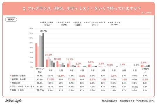 対照的に、最も所有率が低かったのは「専業主婦」で、「持っていない」は65.9%でした。料理や家事の最中に香りが邪魔になることを避けたり、家族への配慮から使用を控えたりする傾向が強いことがうかがえます。